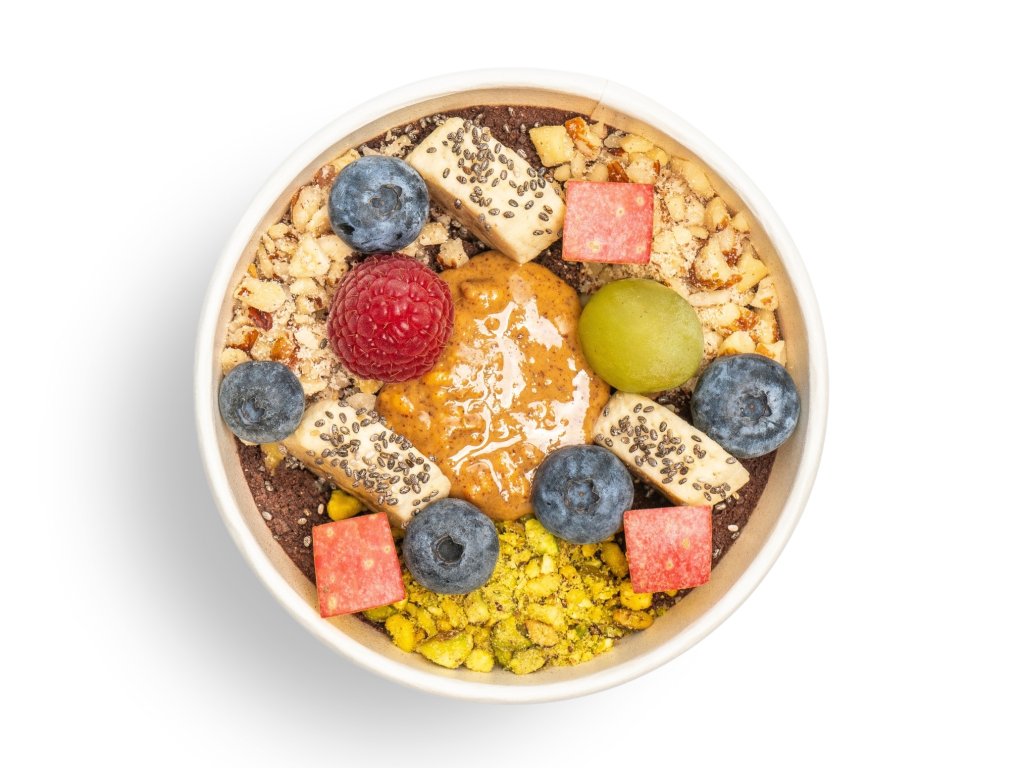 Ovsená kaša posypaná 70% čokoládou, drvené pistácie, lieskovce a mandle, arašidové maslo „Crunchy“, banány, maliny, čučoriedky, jablká, hrozno chia, škorica. 300g.