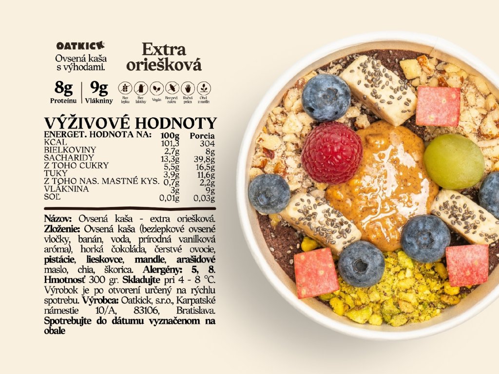 Oatkick ovsené kaše varíme podľa nášho receptu každý deň čerstvé. Po miernom vychladnutí ich ručne posypeme strúhanou horkou čokoládou a na vrch ukladáme výber zdravých orieškov, semienok a čerstvého ovocia. Oatkick ovsené kaše sú certifikovane bezlepkové, bez laktózy, bez pridaného cukru, bez konzervantov a balené v kompostovateľných obaloch. Chutia výborne za studena ale aj pri izbovej teplote. Zloženie, alergény a výživové hodnoty nájdeš na druhej fotke produktu. Trvanlivosť je 24 hodín pri izbovej teplote a 48 hodín pri teplote do 8°C.