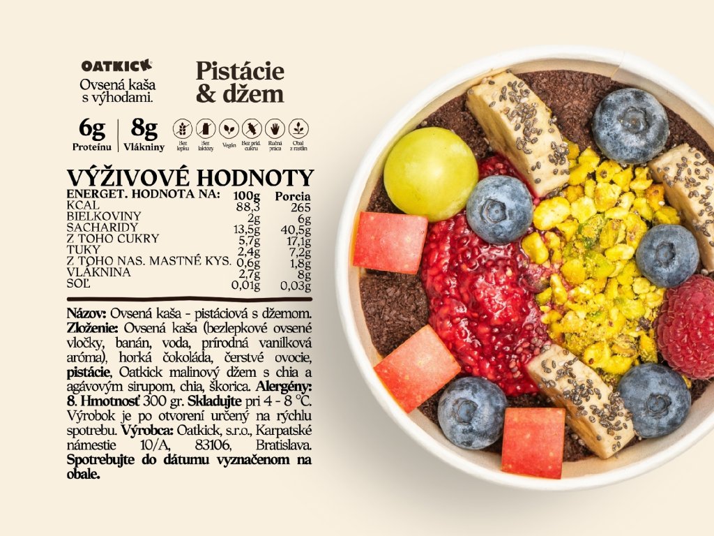 Oatkick ovsené kaše varíme podľa nášho receptu každý deň čerstvé. Po miernom vychladnutí ich ručne posypeme strúhanou horkou čokoládou a na vrch ukladáme výber zdravých orieškov, semienok a čerstvého ovocia. Oatkick ovsené kaše sú certifikovane bezlepkové, bez laktózy, bez pridaného cukru, bez konzervantov a balené v kompostovateľných obaloch. Chutia výborne za studena ale aj pri izbovej teplote. Zloženie, alergény a výživové hodnoty nájdeš na druhej fotke produktu. Trvanlivosť je 24 hodín pri izbovej teplote a 48 hodín pri teplote do 8°C.